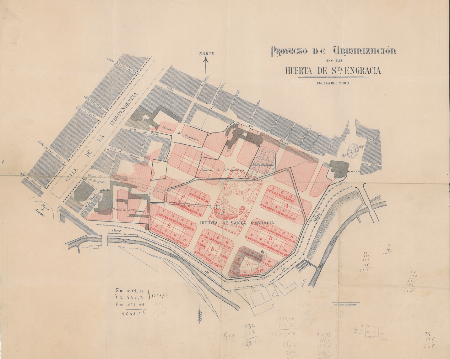 La celebración de la Exposición Hispano-Francesa, que conmemora el primer Centenario de los Sitios de Zaragoza en 1908, impulsó la urbanización del sector de la Huerta de Santa Engracia. Este plano, perteneciente al fondo de la Escuela Universitaria de Ingeniería Técnica Industrial del Archivo, de 1906 del Proyecto de Urbanización de la zona dibuja la actual plaza de los Sitios y sus manzanas colindantes.